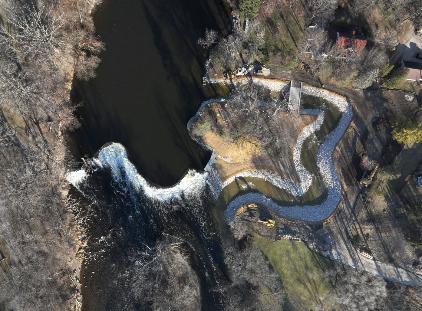 Kletzsch Falls on the Milwaukee River in Glendale has posed an obstacle for migrating fish since it was built in 1935. However a new fish passage on the eastern shore of the river (visible in background) is allowing Lake Sturgeon and other fish to access upstream portions of the river.